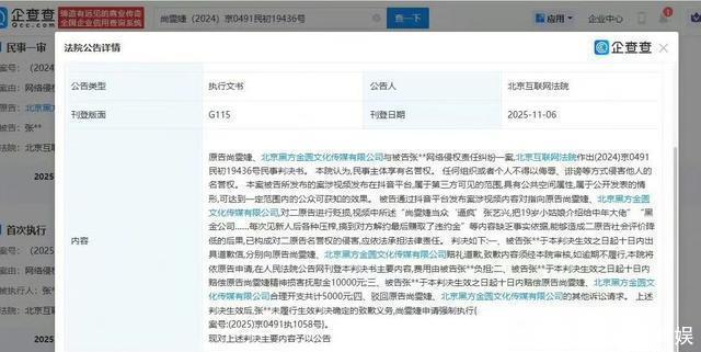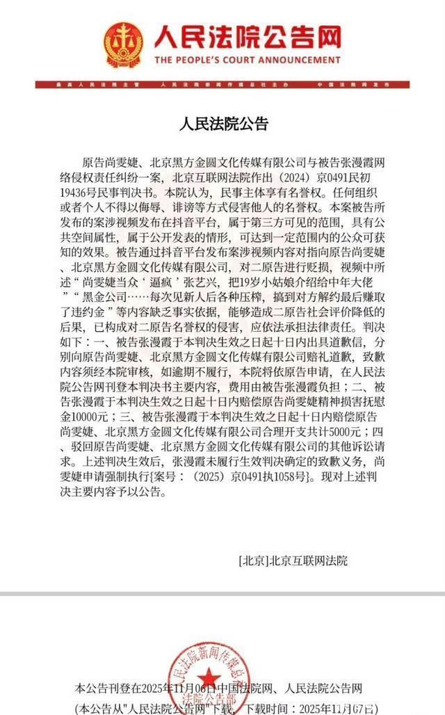 法院公告显示,被告张某某发布案涉视频内容对指向原告尚雯婕、北京黑方金圆文化传媒有限公司,视频中所述“尚雯婕当众‘逼疯’张艺兴,每次见新人后各种压榨,搞到对方解约最后赚取了违约金”等内容缺乏事实依据。法院判决,张某某公开赔礼道歉并赔偿尚雯婕精神损害抚慰金10000元、合理开支共计5000元。